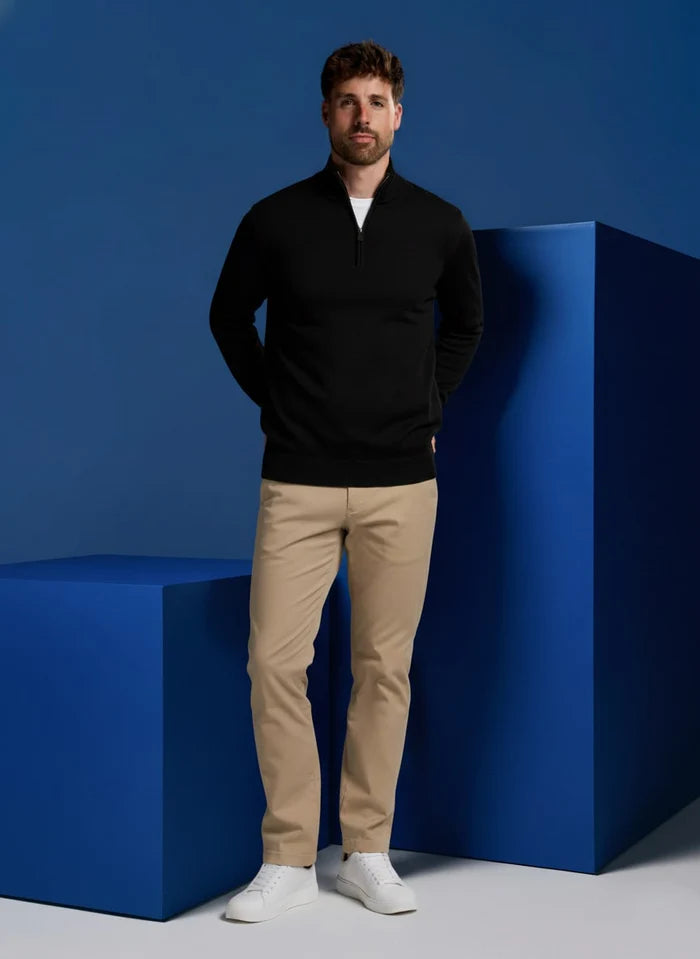 Vergiss sperrige Pullover und einschränkende Stoffe. Dieser Pullover bietet einen raffinierten, athletischen Schnitt und einen hochwertigen Reißverschluss für ultimative Vielseitigkeit. Ob du ihn über einem Hemd fürs Büro trägst oder es am Wochenende lässig hältst, du erhältst die perfekte Balance zwischen professionellem Stil und völliger Bewegungsfreiheit.